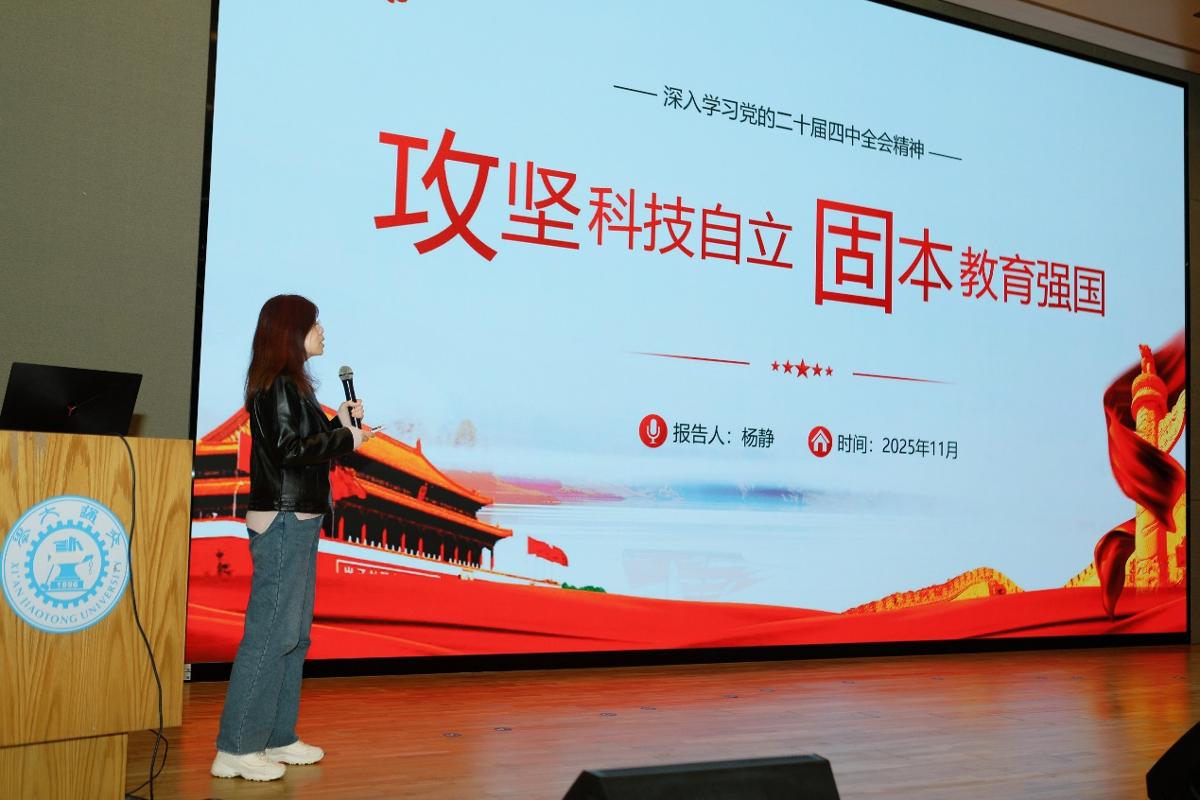 杨静开展“攻坚科技自立、固本教育强国”党课培训。她表示,当前科技发展与国家战略需求密切相关,自动化学院党员应以更高政治站位、更严标准要求自己,将科研追求与国家重大需求紧密相连。她指出,党员要把日常科研、学习和工作作为践行初心使命的重要阵地,用行动塑造党员形象,用成果体现时代担当。