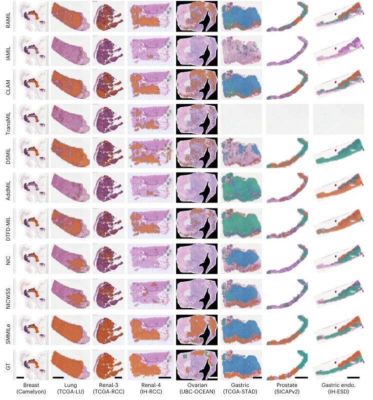 在具体评估中,研究团队基于涵盖乳腺、肺、卵巢、肾、胃和前列腺等六种癌症的3850张全切片,对SMMILe与九种当前主流计算病理学方法进行了系统比较。结果表明,在切片级分类任务中,SMMILe在各数据集上的整体表现达到或优于现有方法;在更具挑战性的病灶空间量化任务中,其在多个数据集上的空间AUC接近或超过90%,空间F1相较最佳对比方法最高可提升20个百分点以上。即便在采用病理基础模型等更强特征编码器、整体性能普遍抬升的条件下,SMMILe仍在多项空间指标上保持明显优势,尤其在多标签等复杂任务中表现突出。