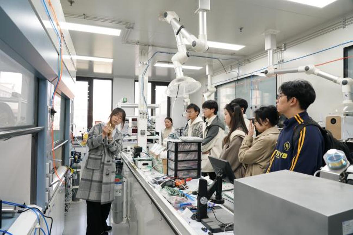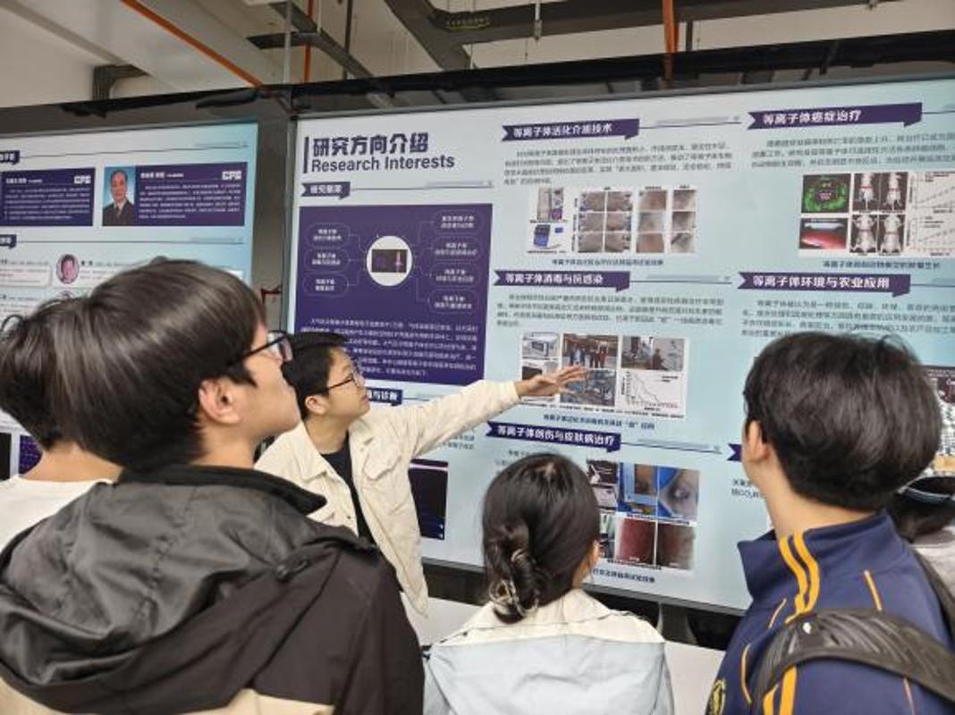 在等离子体生物医学研究中心,由中心成员叶子豪带领同学们参观暗室、气瓶室,现场展示等离子体活化水装置、等离子体消毒机等成果转化产品,直观了解技术研发—实物转化的实际过程,建立对交叉学科科研的初步认知。在电力设备在线监测技术实验室,硕5062党支部成员丁若宸带领同学们近距离观察传感器制备设备,理解各工艺环节的逻辑关联,厘清专业设备与技术原理的对应关系。在材料镀膜实验室,同学们观看薄膜沉积操作、传感器性能测试全过程,了解测试数据的分析方法。