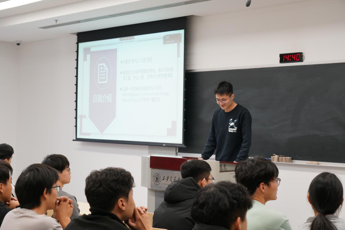在“科研启航”环节,硕 5062 党支部王家浩围绕本科生科研入门作分享,从“科研是什么、为什么做科研、如何开始科研”展开,结合自身经历,鼓励学弟学妹“大胆联系老师、主动沟通想法、坚持不自我怀疑”,打消科研畏难情绪。