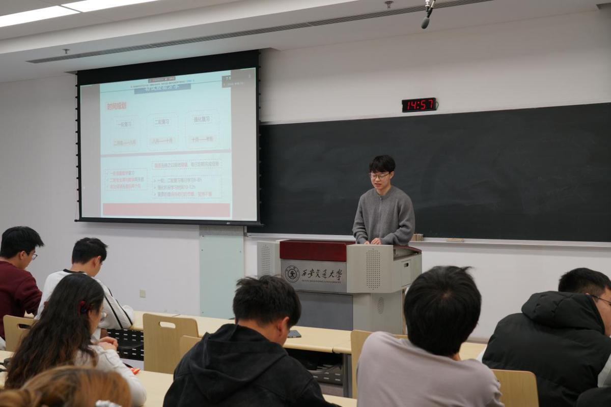“考研引路”环节同样干货满满。硕5073党支部陈昶安提出“分阶段规划”策略,强调“考研是持久战,需合理分配时间、保持良好心态”。硕5062党支部刘森则分享自己在备考过程中的练习技巧,鼓励同学们善用自身优势积极备考。