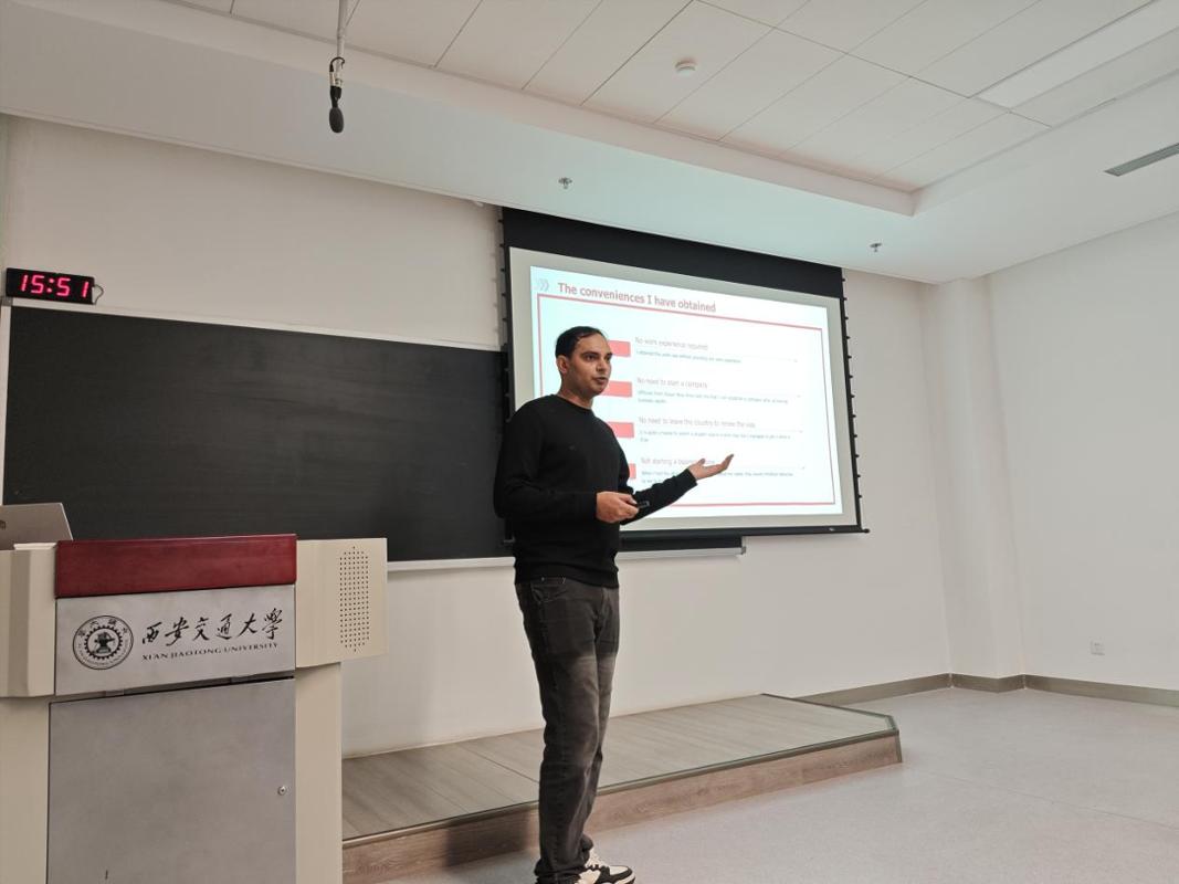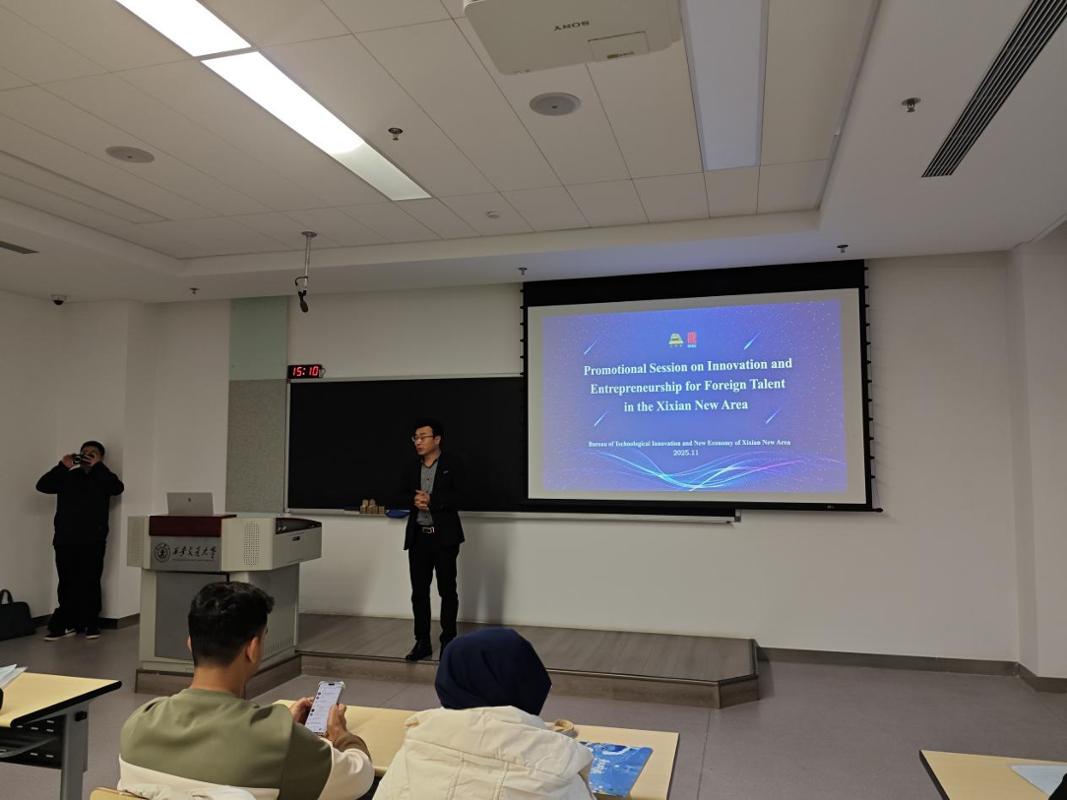 宣讲会还特别设置经验分享环节。西安交大2025届巴基斯坦籍校友Ismail Muhammad结合自身经历,分享了今年9月在西咸新区成功启动国际旅游创业项目的实践心得。他通过真实案例,向学弟学妹们讲述了创业过程中的注意事项,并介绍了在西咸新区创业所能享受到的各项便利服务,为有志于创业的同学们提供了宝贵参考。