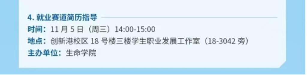 为给参赛选手更好的大赛参与体验和参赛技能指导服务,就创中心联合生命学院搭建涵盖简历指导和经验分享等内容的备赛支持体系,分享活动分别从评委、选手和指导老师角度分享参赛经验,在职业目标、经历梳理和发展路径等方面提供操作性强的建议,帮助同学们理解赛制规则、提升自我认知、备赛技巧和自信心;简历指导从大赛材料准备方面提升简历质量,帮助同学们以更加饱满的状态投身比赛当中。