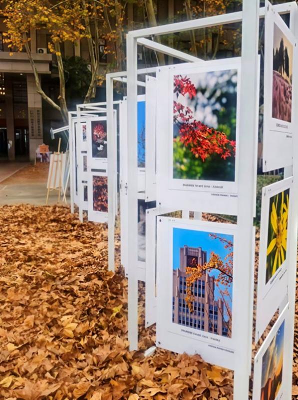 梧桐落叶铺作软毯,摄影展框立于冬阳之下,行人慢步其间,于定格的画面中,品味金色交大的诗意。