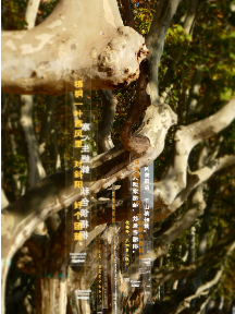 疏朗的梧桐枝桠间,悬挂着与梧桐相关的诗句。阳光穿过枝叶,洒下斑驳的光点,诗句也如墨染一般映照在枝干上,别有“诗意交大”的浪漫氛围。