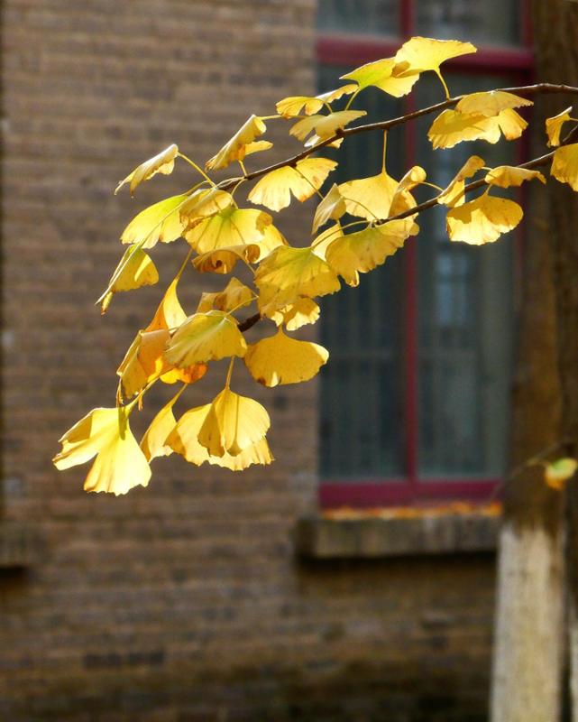 红砖墙角,银杏枝斜伸而出,扇形的叶片缀满枝头,金黄耀眼。校园中一处平凡的角落,也藏着不期而遇的小小温暖。
