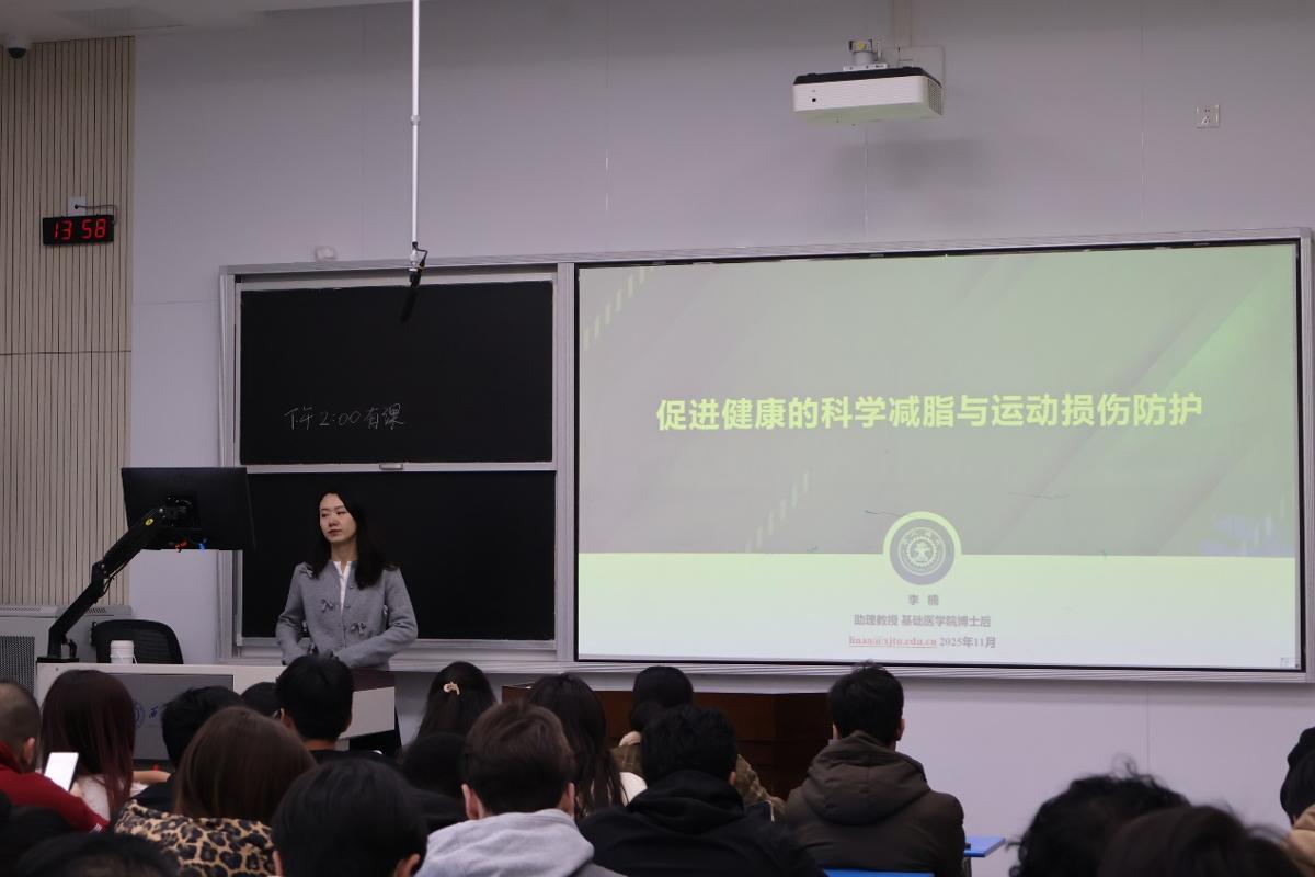 李楠从全球肥胖趋势入手,系统讲解了肥胖对呼吸、心血管、代谢、骨骼等多系统健康的影响,并指出了体力活动缺乏所带来的多种健康风险。她结合最新研究和临床数据,深入剖析了常见的减脂误区,如过度依赖减肥药物、极端节食、饮食结构不合理等,引导学生树立“心理—营养—运动”三位一体的科学减脂观念。