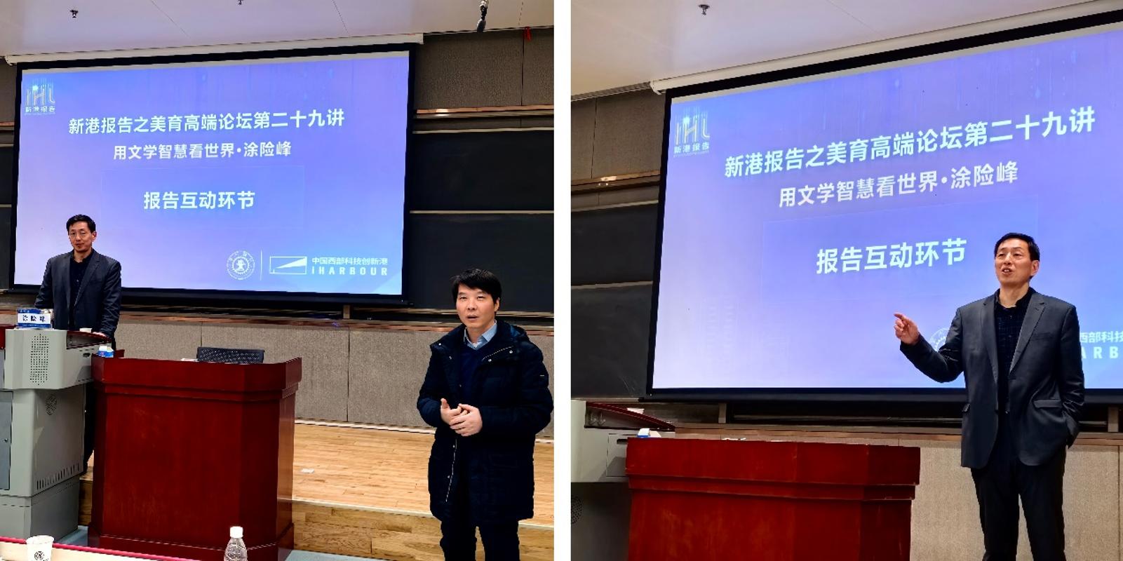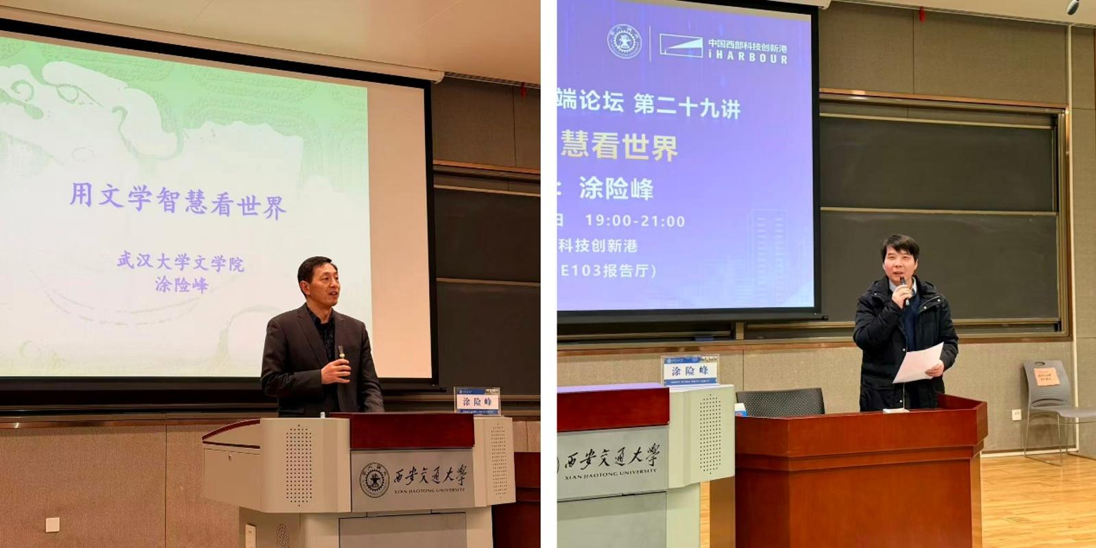 为营造高校美育氛围,提升学生审美感受力和鉴赏力,12月2日晚,由西安交通大学研究生院主办、人文学院承办的“新港报告之美育高端论坛”第二十九讲在西安交通大学创新港校区涵英楼报告厅成功举办。本次讲座以“用文学智慧看世界”为主题,特邀武汉大学文学院教授、比较文学与世界文学专业博士生导师涂险峰教授担任主讲嘉宾。讲座由人文学院副院长张勇主持,人文学院中文系教授魏策策、青年教师谭静等代表出席。全校各专业硕博研究生积极参加讲座,会场座无虚席。