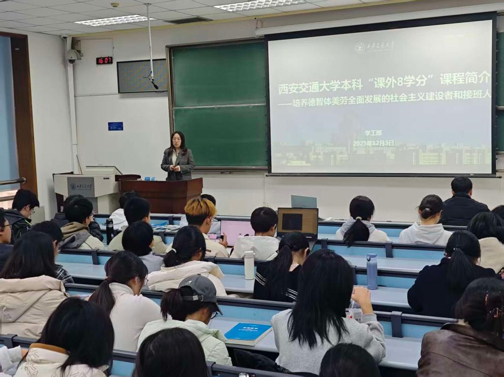魏波老师根据德育智育需求,联系外校教育经验介绍了课外8学分的设置背景及目的。基于对于未来的三个问题、明确两个重要任务,对本校的认知桥、资源桥、能力桥三个方面作统一介绍。最后,她向大家介绍了智慧社区登录、查看的方法,展示了“一站式”学生社区成长档案,介绍其积分构成,展示优秀学生标兵,并对同学们作出勉励。魏波老师深度拆解了课外8学分体系,为同学们明确了课内与课外学分的构成权重,强调课外8学分对综合素质提升的重要性,解答了同学们关于课外8学分体系的疑惑,为学生绘制出清晰可达成的成长路线图。