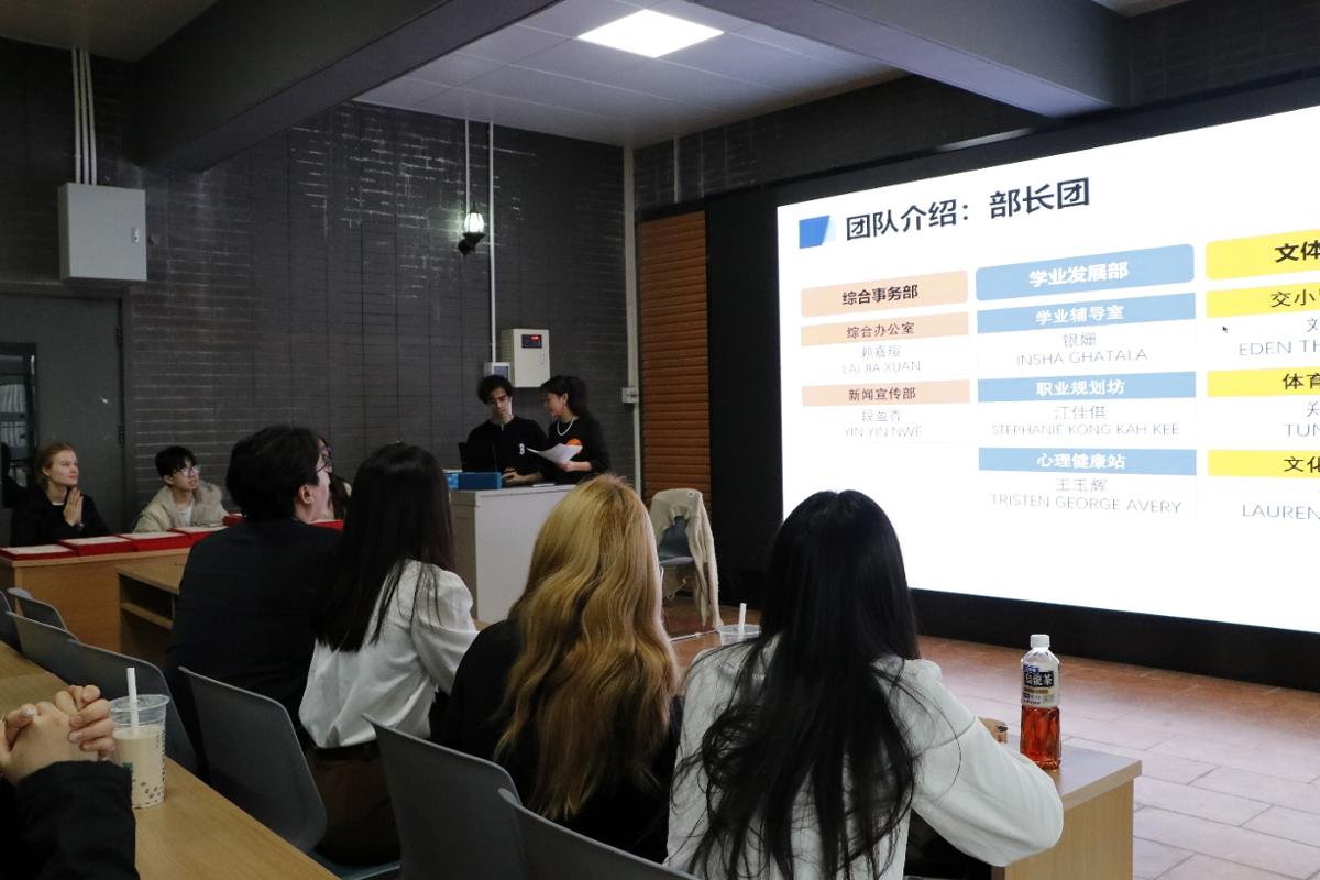 会长团成员依次发言。综合事务部由娜丝佳、学业发展部丁云廷、文体活动部杨惠媃、实践服务部李家暄分别介绍部门情况及已开展的各项亮点工作。