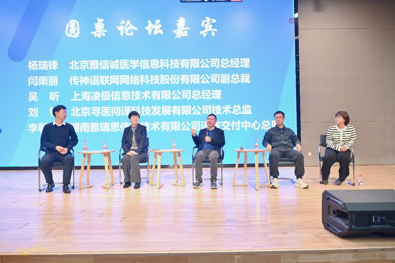 随后的圆桌论坛由中国翻译协会医学语言服务专业委员会副秘书长、广东外语外贸大学陈庆主持,来自五家企业的代表以“智语医言:语言服务与国际传播”为主题,围绕技术应用、校企协同、人才需求等话题展开了深度对话。