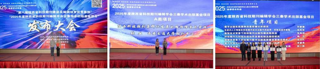 会议颁发了“陕西省科技期刊发展卓越贡献奖”,西安交大期刊中心主任张丛获奖,全省仅1项;发布了2025年度陕西省科技期刊编辑学会三秦学术出版基金入选项目,共有A类、B类项目各1项,C类项目3项,青年项目7项。张丛申报的《陕西科技期刊集群化发展的路径探索与实践》入选A类项目,编辑商丹申报的《科技期刊与科技社团协同发展机制及路径研究》入选青年项目。