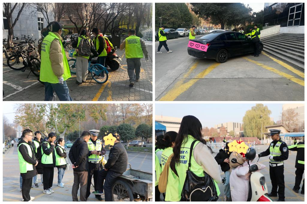 理论学习结束后,实践环节同步开展。经过岗前集中培训,同学们以小组为单位,在交警和保卫处工作人员的带领下奔赴各指定岗位开展实践工作。在兴庆校区南门东侧、西侧入口,同学们化身交通安全志愿者,协助核查入校摩托车及非机动车校园射频识别卡,提醒骑行师生正确佩戴头盔、禁止违规载人;另一组同学开展违停非机动车摆放工作,并通过校园“安全隐患随手拍”平台上报车辆违停、路口视线盲区等交通安全隐患。同学们各司其职、文明引导,积极解答师生疑问,以实际行动践行交通安全责任。