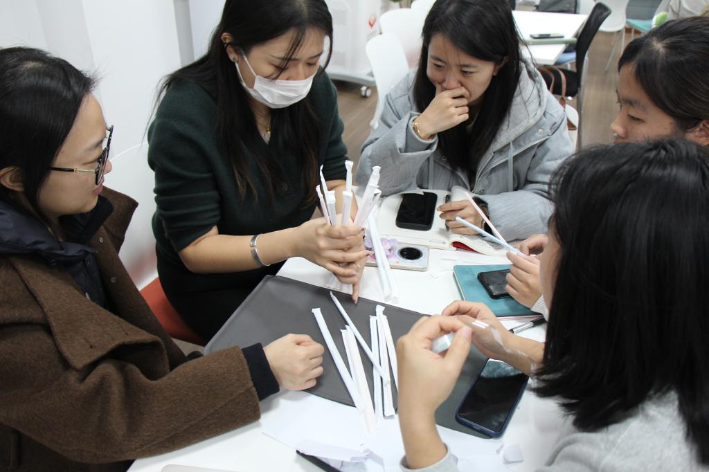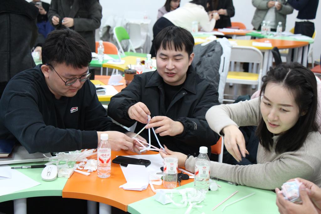 在培训实践环节,参训辅导员分组开展“保护鸡蛋”团辅活动。各小组运用吸管、胶带等有限材料,协作设计鸡蛋保护装置并完成高空坠落测试。鸡蛋的易碎性被类比为学生工作中的关键任务与特殊关怀对象,辅导员通过方案设计、分工协作、风险预判及应急调整全流程,切身体会如何引导学生干部强化责任意识、优化资源配置、提升协同效能。该活动以具象化方式模拟学生工作实际,生动诠释了工作中既需分工明确、各司其职,也要密切配合、及时补位的重要理念,为辅导员指导学生干部开展团队协作提供了直观案例与实践参考。