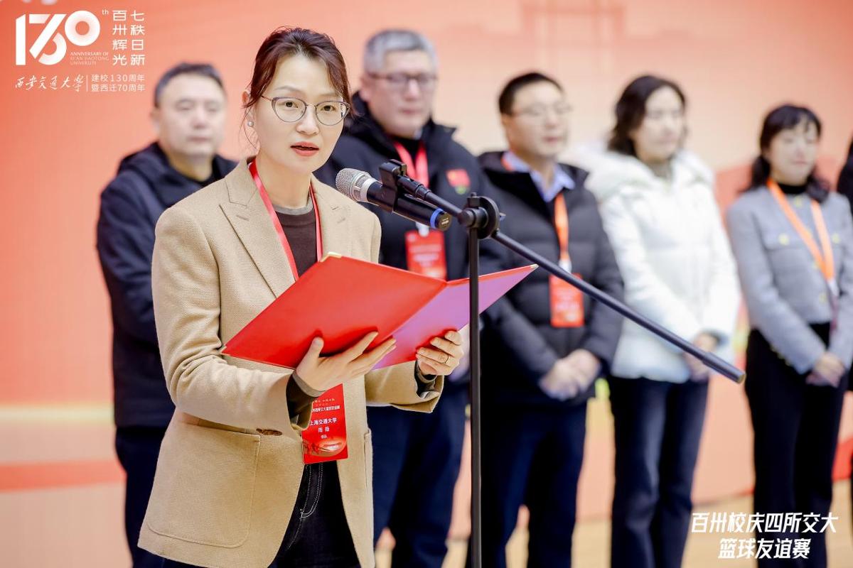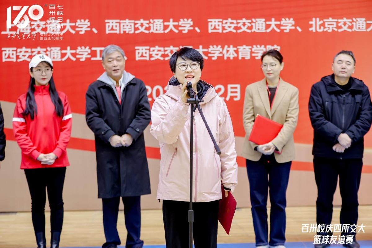 开幕式上,王欢代表西安交通大学向参加比赛的各兄弟高校老师、同学和校友们致以热情欢迎。她表示,本次篮球赛是四校共庆百卅华诞的首场体育比赛活动,希望以本次比赛为契机,进一步促进四校体育文化交流,打造交通大学师生校友文体交流的亮丽名片,进一步凝聚“交大一家人”的情感纽带,共同守护交大文化根脉,将弘扬拼搏奋进的体育精神融入服务国家、奉献社会中,共同携手为强国建设、民族复兴贡献交大智慧与力量。