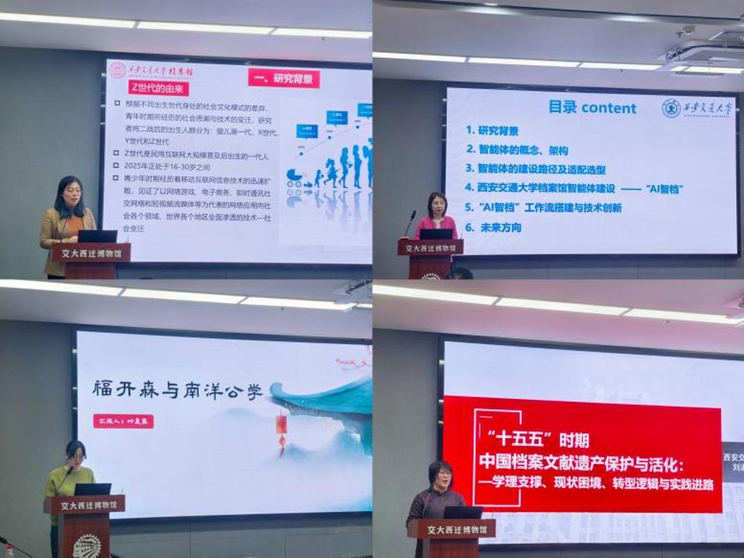 为了加强党建与业务的深度融合,4位业务骨干结合红色校史资源挖掘与文博工作创新发展作了专题报告。南锋霞同志以《Z世代亚文化视域下红色档案育人的创新路径》为题,探讨了如何顺应时代特点和青年需求,创新红色档案资源的开发利用与育人模式。王华泾同志在《多智能体架构驱动下档案馆智慧化转型的探索与实践》报告中,分享了运用前沿信息技术推动档案馆管理服务智能化升级的前沿思考与实践探索。叶晨露同志的报告《福开森与南洋公学》,从校史人物视角切入,挖掘了校史中的珍贵记忆,丰富了大家对学校早期发展历程的认识。刘淑妮同志围绕《“十五五”时期中国档案文献遗产的保护与活化:学理支撑、现状困境、转型逻辑与实践进路》这一主题,进行了系统阐述,为未来档案文献遗产保护利用工作提供了有益参考。