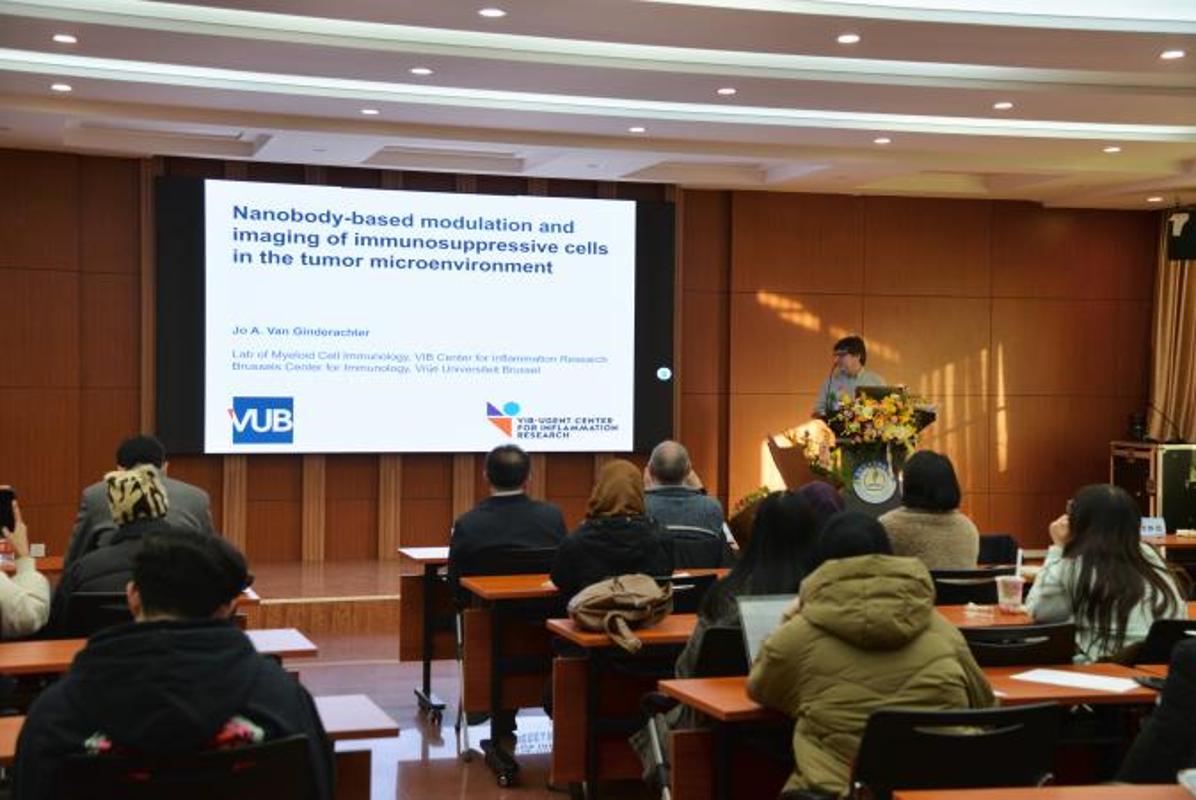 Van Ginderachter教授作了题为“Nanobody-based modulation and imaging of immunosuppressive cells in the tumor microenvironment”(基于纳米抗体的肿瘤微环境免疫抑制细胞调控与成像)的学术报告。他系统介绍了其团队如何利用纳米抗体技术研究肿瘤微环境中单核细胞、巨噬细胞、树突状细胞及调节性T细胞等免疫调节细胞的异质性与功能,并开发相应的诊断与治疗策略的相关情况。