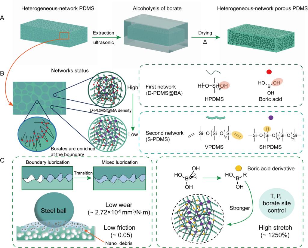 西安交通大学秦立果、杨森教授团队聚焦硼酸酯驱动的非均相弹性体网络形成机制,从吉布斯相律出发,首次提出一种可同步实现优异摩擦学性能、可控孔结构与强力学性能的异质网络多孔弹性体制备策略。该研究采用两种相似Si-O骨架链的PDMS网络作为基础体系,通过硼酸酯基团不相容的特点,驱动网络发生异质相分离并稳定相边界,成功构建出了异质网络预聚物;经热固化与醇解处理后,最终制备出机械性能可编辑的异质网络多孔聚二甲基硅氧烷(HNP-PDMS)弹性体。特定的HNP-PDMS弹性体展现出优异的摩擦学性能:在盐水环境中可自发产生腐蚀诱导的自润滑效应,促使润滑状态从边界润滑向混合润滑转变,呈现出非典型的超低摩擦与抗磨损特性,其摩擦系数和磨损率较原始基体可下降90%以上。调控制备过程中的温度、压力及硼酸酯位点分布,该弹性体还可获得优异的机械性能,如拉伸率最高可达1250%;引入疏水基团后,其韧性较已报道的颗粒模板法提升了16倍。
