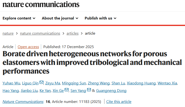近日,相关研究成果以“硼酸酯驱动的异质网络以提高多孔弹性体的摩擦学和机械性能”(Borate Driven Heterogeneous Networks for Porous Elastomers with Improved Tribological and Mechanical Performances)为题发表于国际著名期刊《自然通讯》(Nature Communications,IF:15.7) 。西安交通大学现代设计及转子轴承教育部重点实验室为第一通讯单位,西安交通大学机械学院在读博士生吴宇浩为第一作者,西安交通大学秦立果教授、杨森教授以及福州大学葛新教授为共同通讯作者。联合作者中,西安交通大学闫柯教授和董光能教授对研究工作提供了宝贵建议与支持。该研究工作得到了国家自然科学基金、西安交通大学基本科研业务费(青年创新团队)等项目的大力支持。