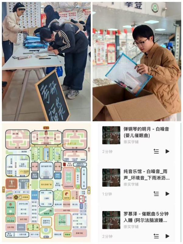 学辅创新构建“心理—生理—环境”三维支持网络,推出校园情绪地图,帮助学生通过空间选择调节情绪;提供“1分钟启动法”、语言优化指南等工具,助力学生缓解焦虑。在状态管理方面,围绕睡眠、饮食、专注力推出科学方案,结合“番茄工作法”等工具推广,营造高效学习氛围;开展“考研送温暖”等专项活动,精准关怀考研学生,彰显“以学生为中心”的育人温度。