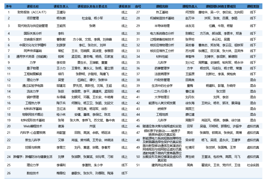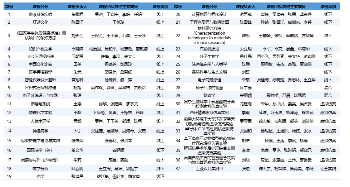 日前,教育部发布《关于公布第三批国家级一流本科课程认定结果的通知》(教高函〔2025〕9号),西安交通大学37门课程入选第三批国家级一流本科课程。其中,线上课程15门、线下课程12门、线上线下混合式课程2门、虚拟仿真课程7门、社会实践课程1门。本次国家级一流本科课程认定是继2020年第一批、2023年第二批认定后的第三批国家级一流本科课程认定,学校累计入选课程166门,总数居全国高校第五位。此外,学校还累计入选省级一流本科课程154门,总数居全省高校第一位。
