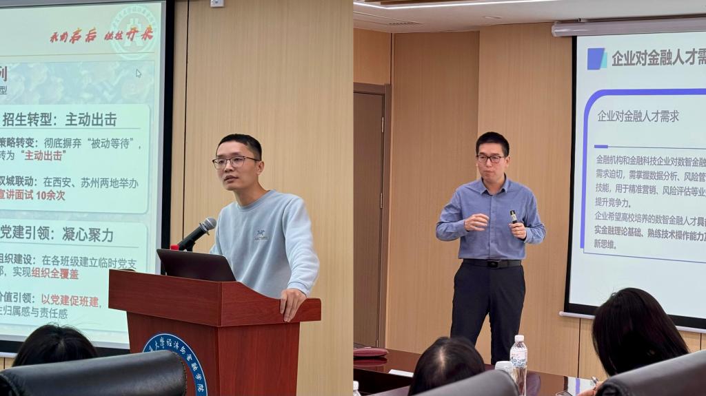 院长助理李江龙代表学院作主题汇报,系统回顾了学院“十四五”期间在学科建设、人才培养、科学研究、社会服务等方面取得的显著成绩,深入剖析了当前面临的机遇与挑战,并重点汇报了“十五五”发展的总体思路、目标与重点任务。金融系主任程茂勇聚焦金融学科建设,详细汇报了学科进展、课程体系改革成效以及“数智实验班”的筹备情况,展现了金融学科顺应时代变革、锐意创新的积极探索。