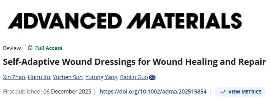 近日,西安交通大学前沿科学技术研究院、金属材料强度全国重点实验室郭保林教授团队应《先进材料》(Advanced Materials)期刊邀请,发表题为《自适应创面敷料用于伤口愈合与修复》(Self-Adaptive Wound Dressings for Wound Healing and Repair)的长篇综述论文。论文围绕伤口愈合的生物学基础与复杂微环境,系统总结了自适应敷料的定义、关键性能、设计策略与代表性材料体系,旨在为下一代智能化、个性化和可转化的创面修复提供系统化设计框架与实践路线。