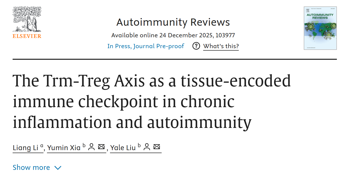 近日,西安交通大学第二附属医院皮肤科刘亚乐/夏育民教授团队在免疫学与自身免疫领域国际权威期刊《自身免疫评论》发表题为《慢性炎症与自身免疫性疾病中的Trm-Treg轴:一种组织编码的免疫检查点》综述,系统阐述了组织驻留记忆T细胞(Trm)与调节性T细胞(Treg)在人体上皮屏障组织(如皮肤、肠道、肺)中形成的动态调控轴,首次将其概念化为一个“组织编码的免疫检查点”,为深入理解慢性炎症和自身免疫疾病的发病机制及开发精准治疗策略提供了全新的理论框架。