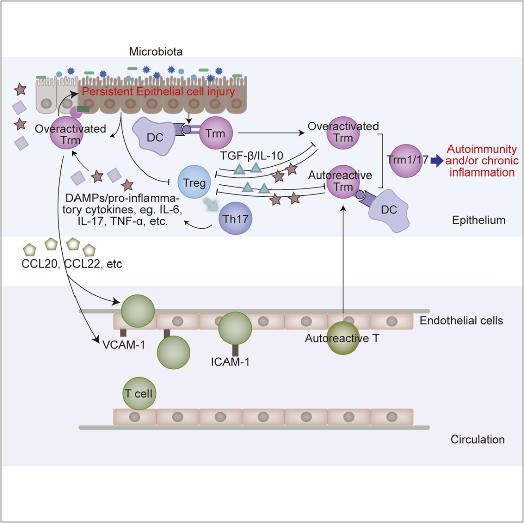 研究发现,当这一轴心因持续损伤、微生物紊乱或慢性炎症而崩溃时,Trm细胞会过度活化,大量释放促炎因子,破坏上皮屏障,并抑制Treg功能,从而形成一个自我持续的炎症恶性循环。这直接推动了如银屑病、炎症性肠病(IBD)、慢性阻塞性肺疾病(COPD)等多种慢性疾病的反复发作和治疗抵抗。