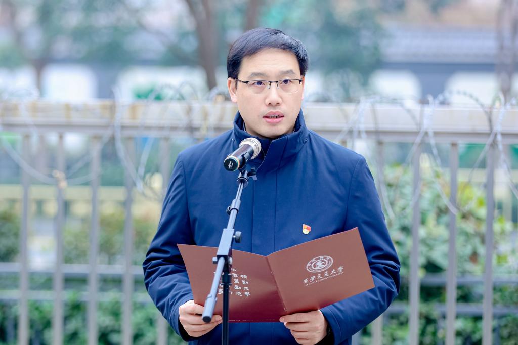 孙早在讲话中指出,交通大学党团组织的百年发展历史,就是一部与党和国家、与民族和人民同呼吸、共命运的奋斗史,交通大学师生用实际行动铸就了纳入中国共产党人精神谱系第一批伟大精神的西迁精神。他表示,交通大学党组织成立100周年的光荣时刻,在西迁广场举行新党员入党宣誓仪式,是传承弘扬伟大建党精神和西迁精神的庄严承诺,更是深刻的党性教育。他指出,要坚持不懈用习近平新时代中国特色社会主义思想凝心铸魂,深刻理解入党誓词的丰富内涵,增强“听党指挥跟党走”的思想自觉、政治自觉、行动自觉,以实际行动坚定拥护“两个确立”、坚决做到“两个维护”;要始终坚守入党誓词的政治承诺,发挥先锋模范作用,自觉接受党组织的教育、管理和监督,做理论学习的先行者、政策宣传的引导者,社会主义核心价值观的践行者、优良师德师风学风的引领者,刻苦钻研的排头兵、创新创造的突击手、服务师生的贴心人;要牢记习近平总书记来校考察重要讲话精神,从百年党团组织发展历史中汲取智慧力量,胸怀“国之大者”,担当为民之责,矢志拼搏奉献。全体师生党员要不忘初心、牢记使命,永葆共产党人的政治本色,以昂扬向上的精神面貌迎接学校建校130周年暨西迁70周年、“十五五”开局之年,为加快建设中国特色、世界一流大学,为强国建设、民族复兴伟业作出属于我们这一代人的卓越贡献。