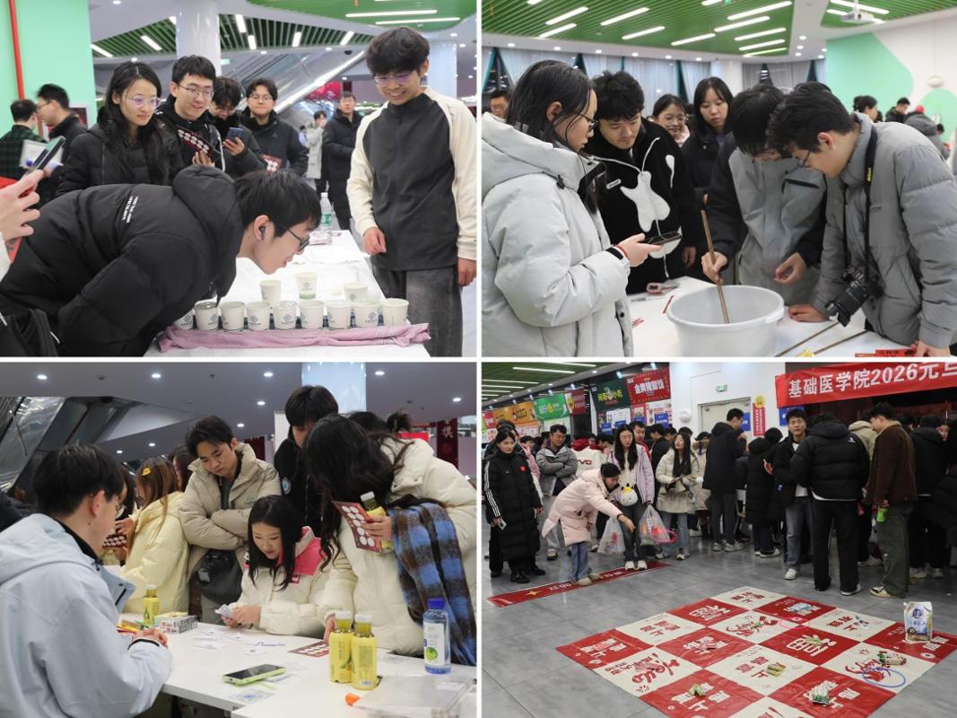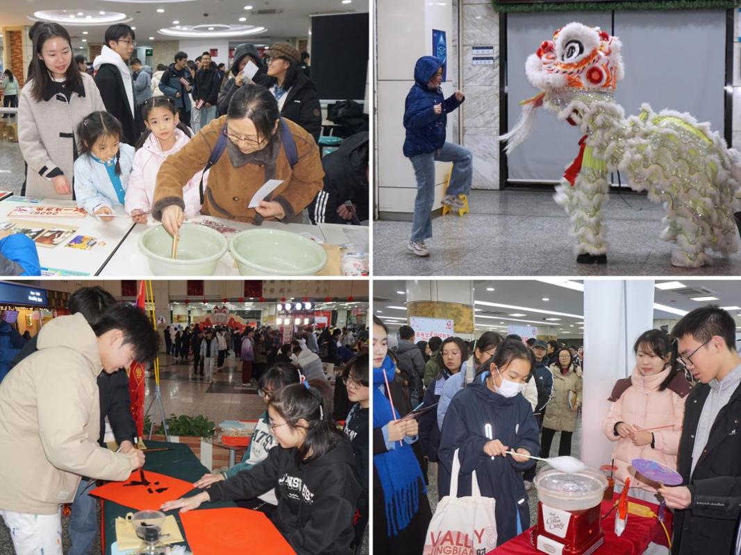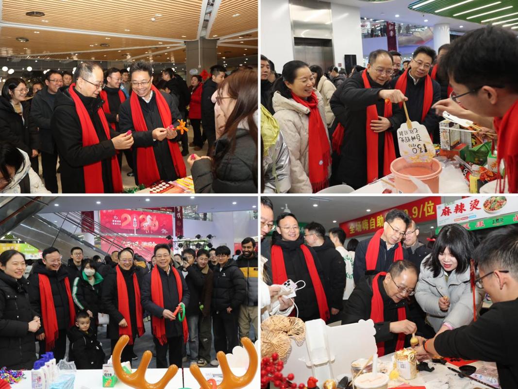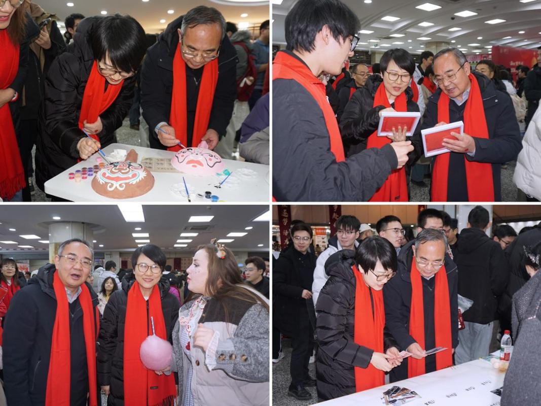 游园会现场喜气洋溢。红灯笼高挂,新年主题展板和“百卅辉光,七秩日新”等校庆元素装点各处。校领导们走进各活动区域,与同学们一起体验趣味游戏和手作项目,为大家的创意与热情点赞,并送上定制文创礼品。亲切的互动、暖心的祝福让欢声笑语流淌在游园会的每个角落。