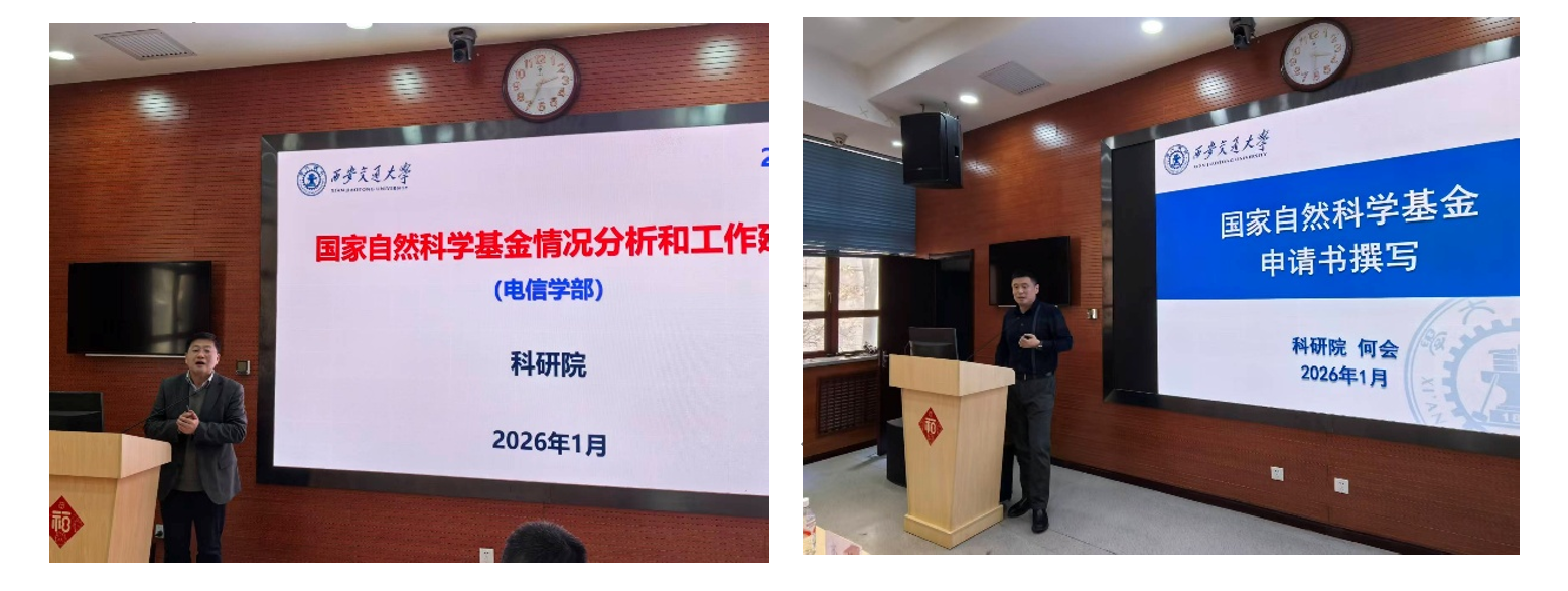 为扎实推进 2026 年国家自然科学基金申报工作,充分调动教师及科研人员的申报热情,全面提升基金申报质量与命中率,1 月 5 日下午,电信学部携手科研院在兴庆校区举办国家自然科学基金动员培训会。科研院副院长刘永忠教授、基础与海外合作处副处长何会出席会议并指导工作,学部特邀电子学院副院长曹猛教授、信通学院王晓凯教授、电子学院董国华教授担任主讲嘉宾,学部各学院教师代表、科研骨干共计 60 余人参会,会议由学部副主任高峰教授主持。