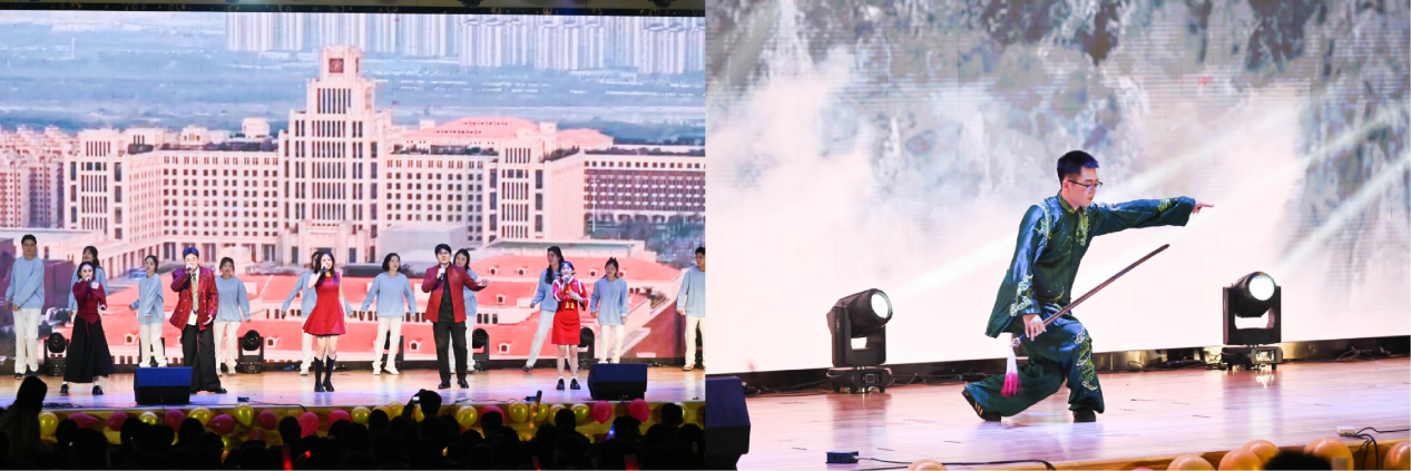 由电气工程学院2025级攀登班带来的原创开场节目《奔跑的梦想》率先登场。唱歌、舞蹈、武术与书法多元融合,气势昂扬、动感十足,瞬间点燃全场热情,为晚会拉开了精彩序幕。