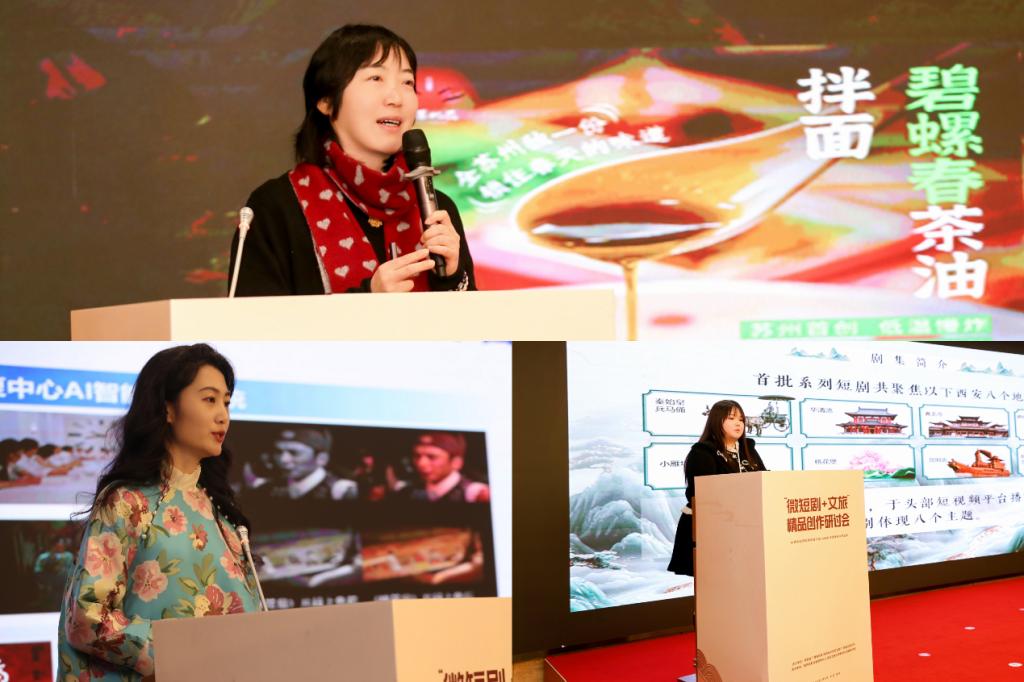 案例分享环节,三位行业代表分享前沿实践案例。苏州更广科技文化传播有限公司副总经理、更苏州主编温玺介绍了《面若桃花》,该片以苏州面为载体构建城市故事,通过“线上+线下”模式实现跨界转化。西影传媒剧集中心创作部主任、制片人张琦晶子分享了《秉文脉之魂,铸光影之器--以匠心共助微短剧精品化高质量发展》,依托影视底蕴打造爆款文旅微短剧,探索“宣传片向情感片升级”的创新路径。陕西芒果影视文化有限公司合伙人、总制片人李珊介绍了《九州万境・大梦千年》,以“一景一剧”模式联动核心文旅地标,实现线上线下热度双赢,为产业发展提供了鲜活范本。