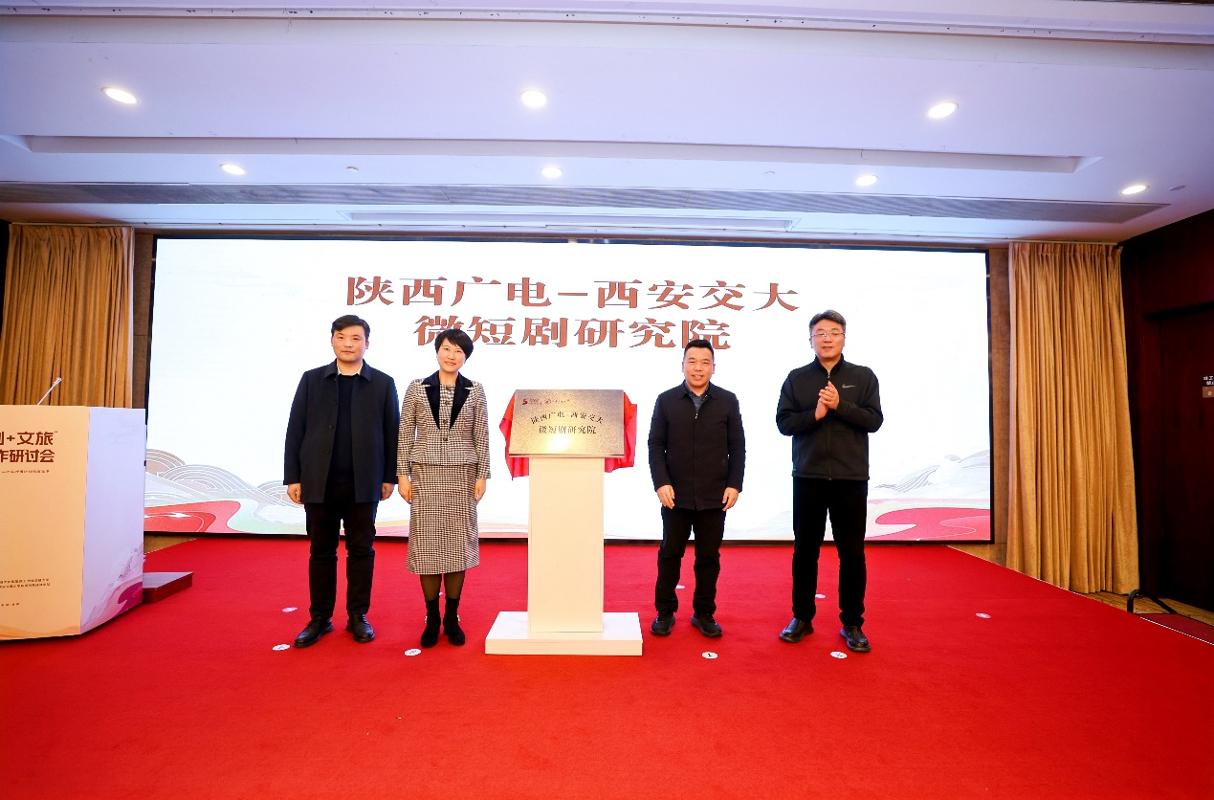 韩棚格,王欢,邱陆,西安交大新闻与新媒体学院党委书记薛周利共同为陕西广电-西安交大微短剧研究院揭牌。