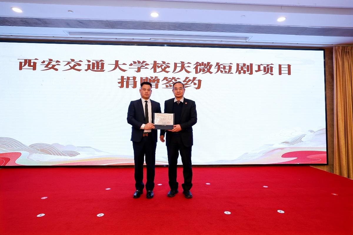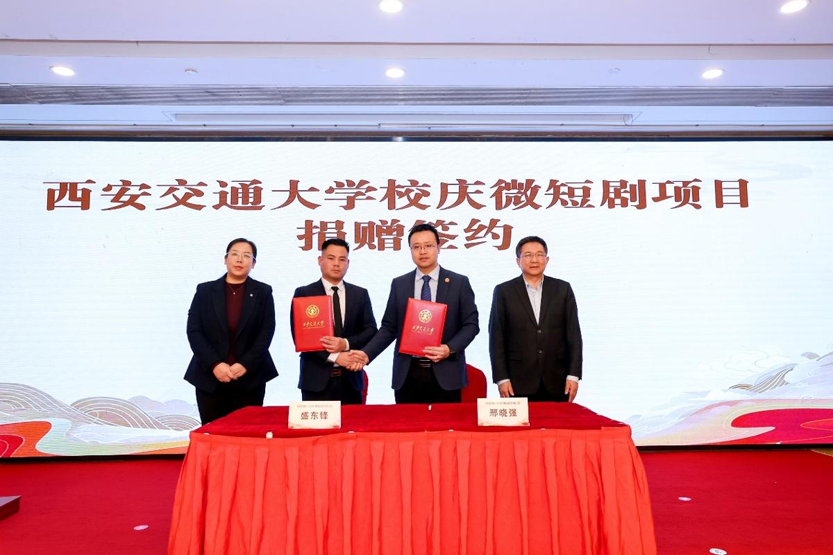 邢晓强与西咸新区嘉园之星酒店管理有限公司董事长盛东锋签署西安交通大学校庆微短剧项目捐赠协议。梅红、西安交大新闻与新媒体学院院长汪文斌见签。成进为捐赠人盛东锋颁发捐赠证书。