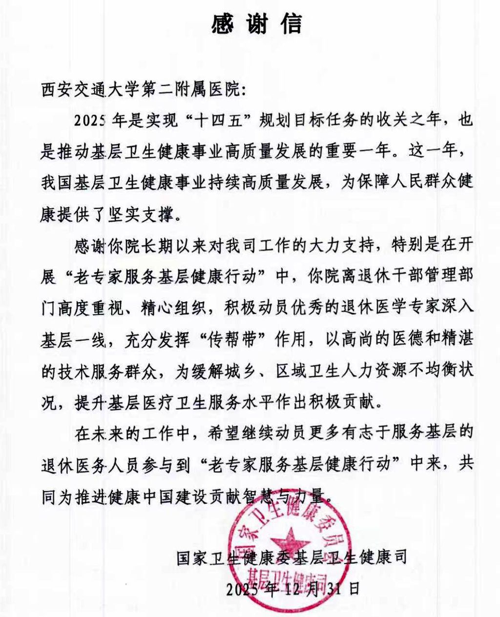 感谢信指出,2025年作为“十四五”规划目标任务的收官之年,也是推动基层卫生健康事业高质量发展的关键一年。这一年,我国基层卫生健康事业持续稳步推进,为保障人民群众健康筑牢了坚实支撑。信中特别感谢西安交大二院长期以来对国家卫健委基层卫生健康司工作的大力支持,尤其在“老专家服务基层健康行动”中,医院离退休干部管理部门高度重视、精心组织,积极动员优秀退休医学专家深入基层一线,以高尚医德与精湛医术发挥“传帮带”作用,为缓解城乡、区域卫生人力资源不均衡现状,提升基层医疗卫生服务水平作出积极贡献。