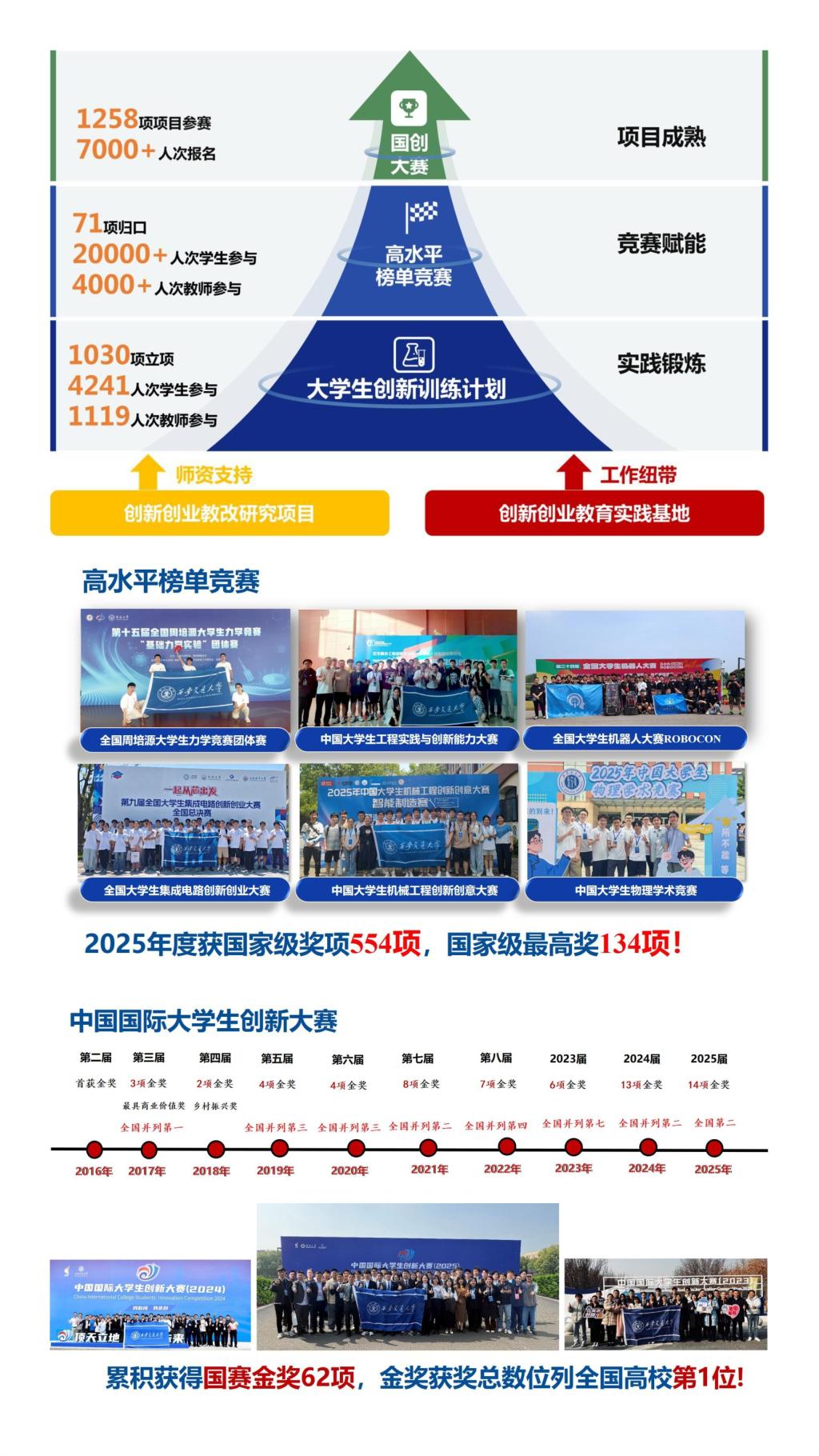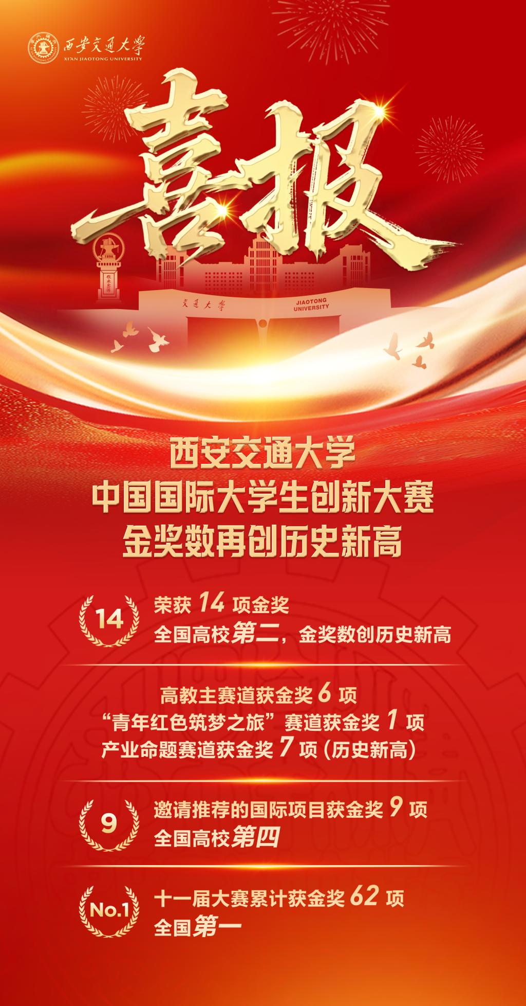 学校尤为注重通过组织学生参与中国国际大学生创新大赛等高水平赛事,引导学生将学习研究与科技前沿、产业关键领域的实际问题紧密结合,有力推动产学研深度融合与协同发展。2025年,西安交大在各类高水平榜单竞赛中荣获国家级奖项554项,其中国家级最高奖项134项。特别是在中国国际大学生创新大赛全国总决赛中斩获金奖14项,位居全国高校第二;在已举办的十一届赛事中,学校累计获得金奖62项,金奖总数位列全国高校之首。
