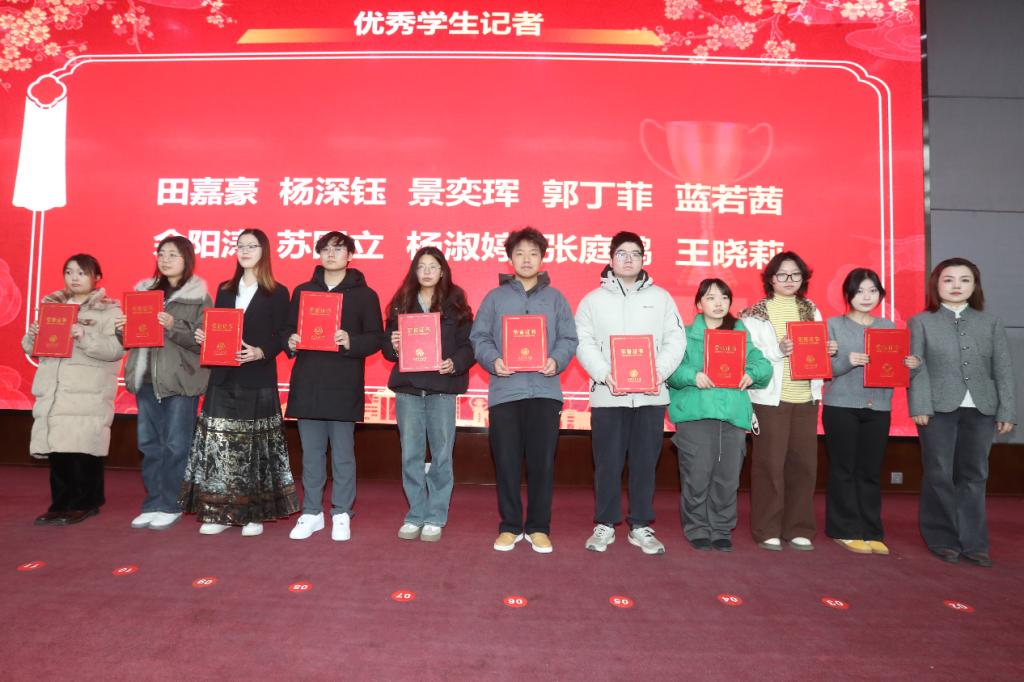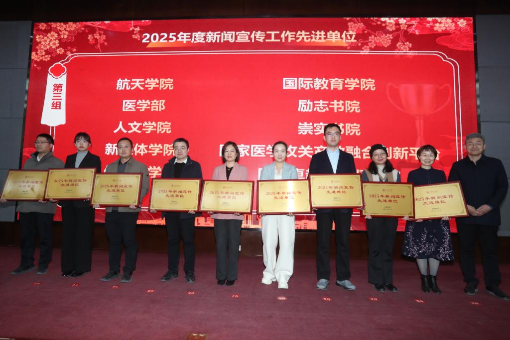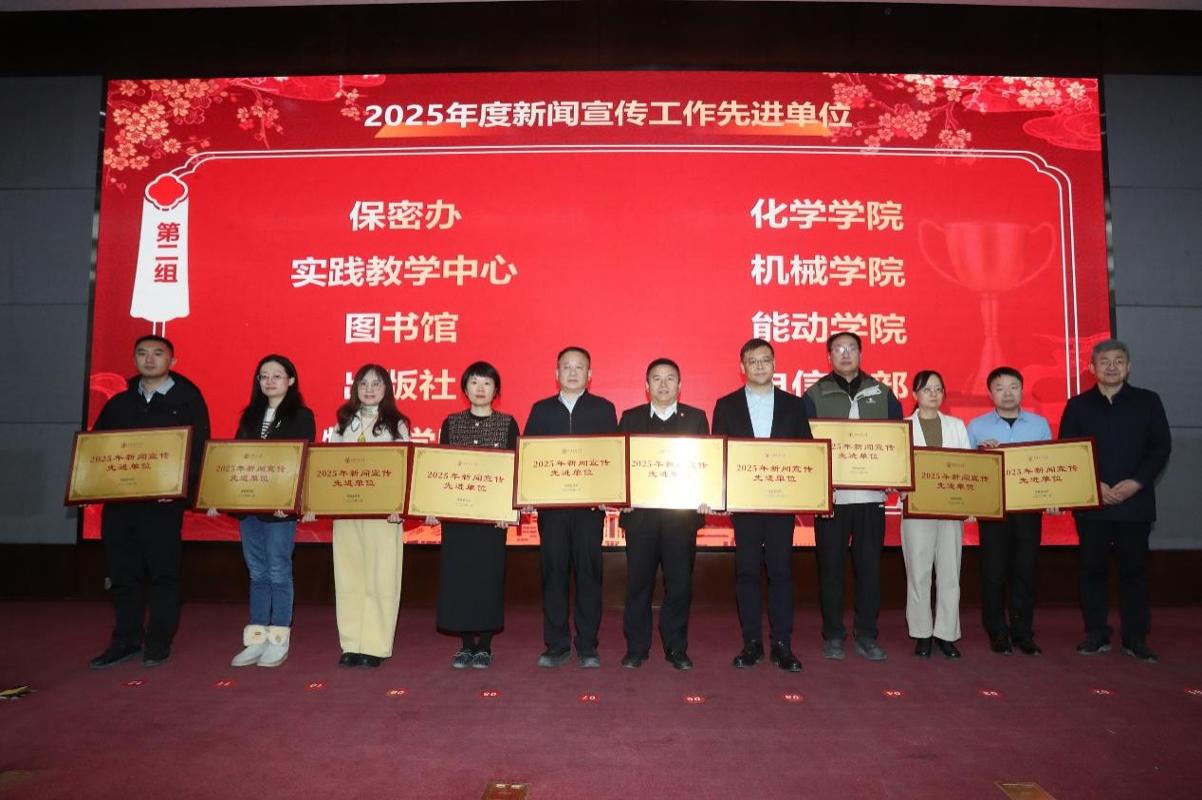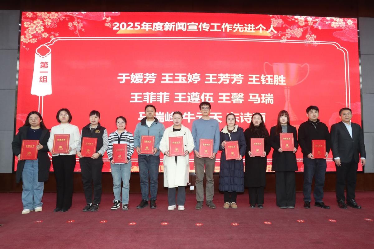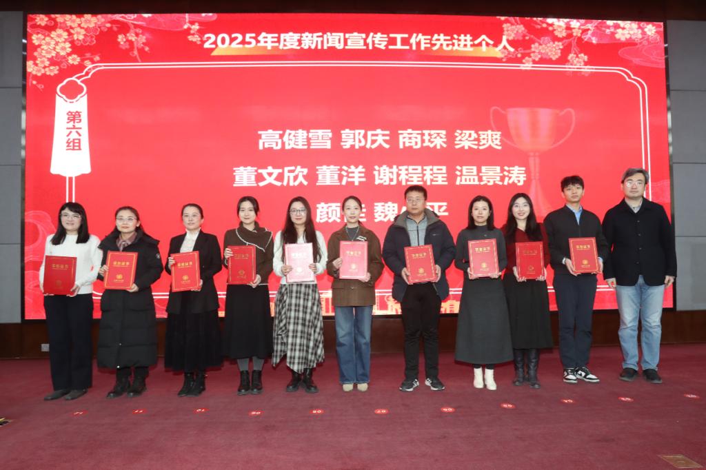 新闻与新媒体学院院长汪文斌、化学学院党委书记张志成、国际教育学院院长温广瑞、人文学院党委书记纪梦然、物理学院党委书记张莹、党委宣传部副部长梁辉分别为2025年度新闻宣传先进个人颁奖。