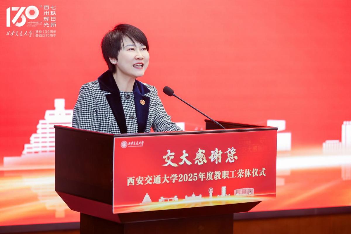 王欢代表学校向荣休教职工致以崇高的敬意与美好的祝福。“感谢大家将毕生心血与青春年华奉献于高等教育事业,并将个人的奋斗历程深深融入西安交大百卅发展的年轮与西迁七十载的壮阔征程。”她表示,荣休教职工用青春与智慧传承弘扬了西迁精神,是学校发展的见证者、参与者和贡献者。站在建校130周年与西迁70周年的历史节点,面对“十五五”开局新征程,她号召全校教职工以荣休前辈为榜样,学习他们勤勉务实、严谨笃行的优良作风,始终胸怀“国之大者”,汲取奋进力量,在人才培养、科学研究、产教融合、社会服务、文化传承创新、国际交流合作等方面砥砺前行,努力在建设中国特色、世界一流大学的道路上迈出更坚实的步伐。同时,希望荣休教职工们继续为学校的改革发展建言献策,贡献智慧和力量。各单位要切实做好荣休教职工服务保障工作,做到思想上关心、生活上照顾、精神上关怀,让大家老有所养、老有所乐、老有所为。