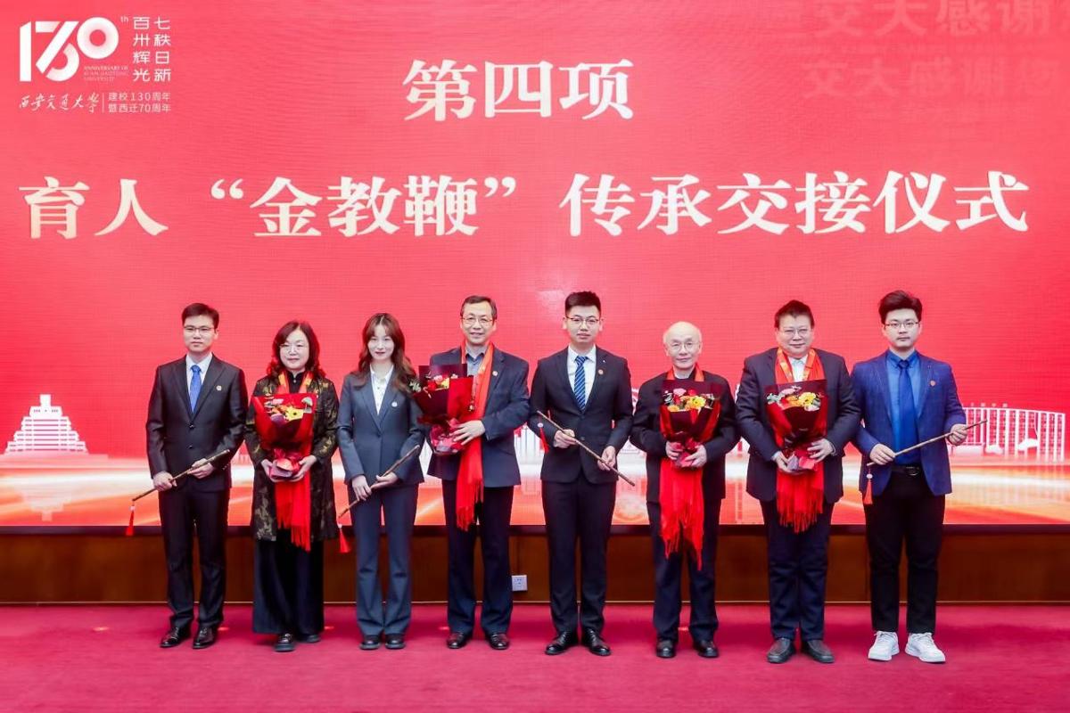薪火相传,继往开来。仪式特别设置了“金教鞭”传承环节。化学学院唐玉海老师、电气学院罗先觉老师、外国语学院黄平安老师、医学部吴小健老师作为前辈教师代表,将象征着育人精神与责任使命的“金教鞭”庄重传递。物理学院韩捷老师、机械学院屈华伟老师、马克思主义学院蒲文娟老师、医学部基础医学院刘磊老师作为青年教师代表,接过“金教鞭”,并向荣休前辈敬献鲜花,继承前辈风范,矢志立德树人。