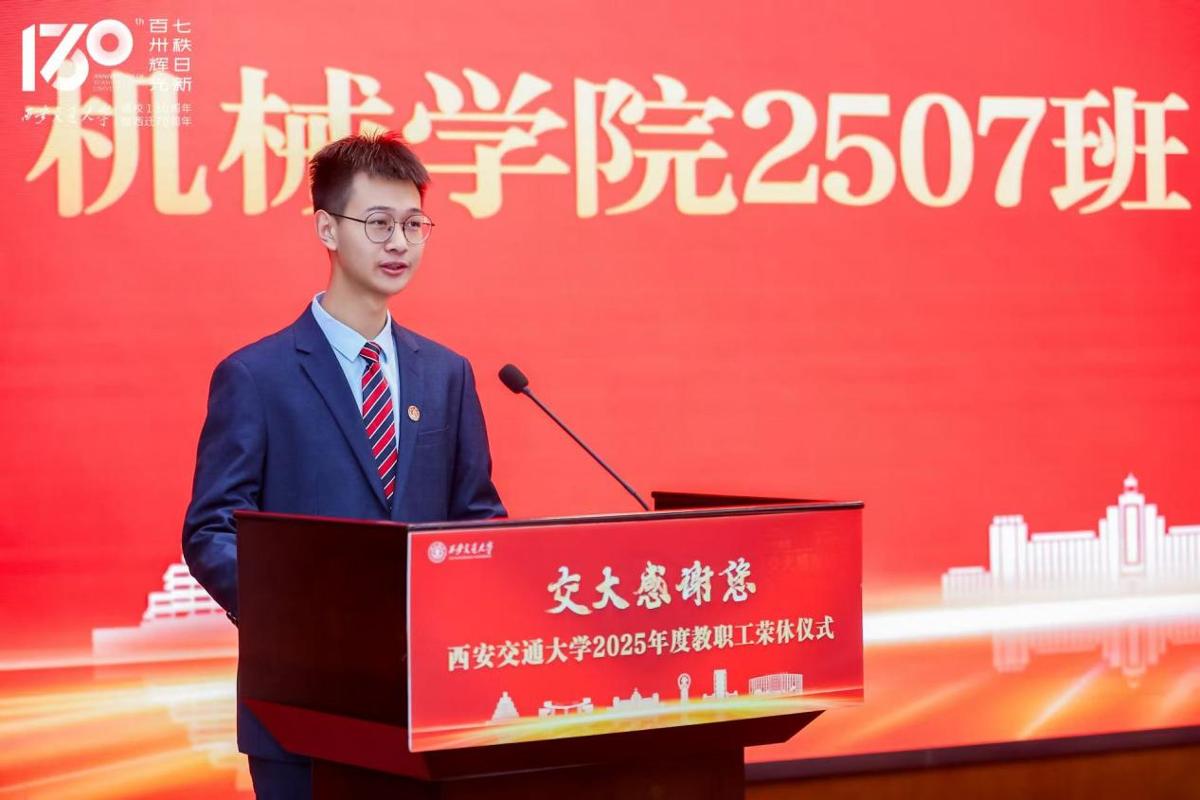 学生代表、机械学院王乾戌代表全体学子感谢老师们的言传身教,并承诺将以老师们为榜样,精勤求学、勇担责任,努力成长为有理想、有本领、有担当的青年,未来服务社会、报效国家。