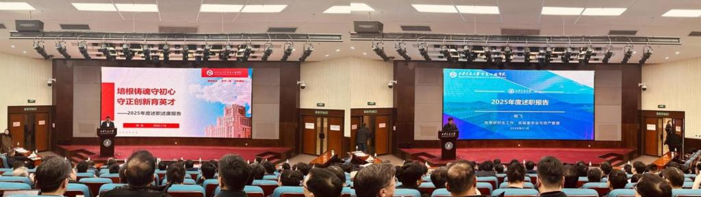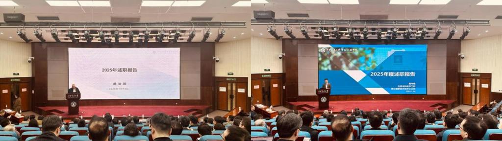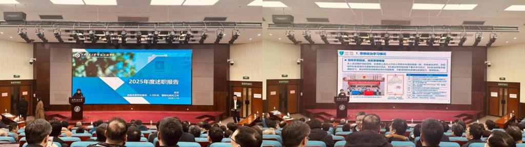 杨旭院长代表学院作年度整体工作汇报。报告全面梳理了过去一年学院在党建引领、学科建设、人才培养、科研创新、国际交流合作、学生工作及实验室建设等方面的显著成效,系统分析了发展过程中存在的问题与挑战,并明确了下一年度重点工作部署。杨旭指出,学院将始终坚守立德树人根本任务,紧扣国家战略需求,持续深化改革创新,以高质量发展助力学校建校130周年暨西迁70周年各项工作。