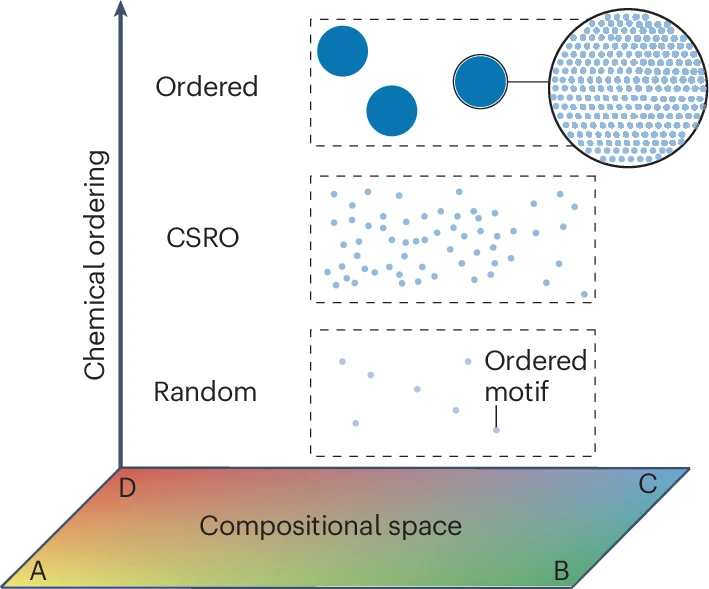 图2.高熵合金中的成分空间与化学结构状态的示意图