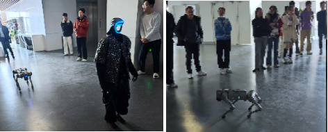 随后进行的智能装备展演将活动推向高潮。宇树科技团队现场展示了人形机器人与机器狗的最新成果:人形机器人灵活完成舞蹈与武术动作,机器狗则以流畅的后空翻和拜年互动赢得阵阵掌声。机器人与师生亲切握手、打招呼的场景,生动体现了具身智能“连接数字世界与物理现实”的独特魅力,现场洋溢着浓厚的科技探索氛围。
