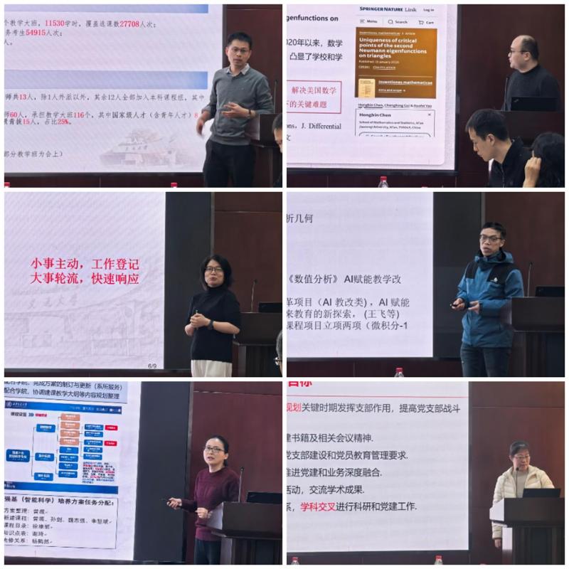 数学与教学中心党支部组织委员缑天祥重点介绍了支部围绕中心工作抓党建、以党建引领系所发展的特色做法与积极影响。应用数学党支部是第二批全国高校党建工作样板支部,支部书记祖建分享了在推动系所中心工作发展方面形成的特色机制与阶段性成果。计算数学师生联合党支部书记王亚婷对照“七个有力”标准,汇报了支部成立以来在理论武装、事业发展等方面取得的进展,并分享了特色活动与育人成效。信息科学党支部2025年获评“陕西高校党建工作样板支部”,支部书记李慧斌系统总结了支部建设经验,分享了支部围绕中心抓党建的举措和成效。统计师生联合党支部书记张春霞围绕党建与业务深度融合,介绍了支部的实践路径与实际成效,该支部也于2025年被评为校级“特色示范党支部”。行政与实验党支部书记罗文成汇报了支部着力构建全方位行政服务与实验辅助体系,有力支撑学院事业高质量发展的具体举措与实施效果。