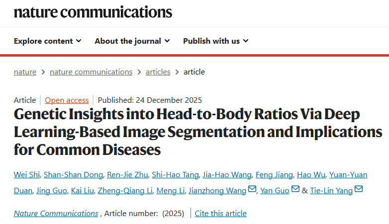 近日,该研究成果以《基于深度学习图像分割的头身比遗传结构解析及其对常见疾病的意义》(Genetic Insights into Head-to-Body Ratios Via Deep Learning-Based Image Segmentation and Implications for Common Diseases)为题,发表在《自然通讯》(Nature Communications)上。该论文通讯作者为西安交通大学生命学院杨铁林教授、郭燕教授和内蒙古医科大学第二附属医院王建忠教授,西安交通大学生命学院博士生史伟和董珊珊副教授为论文共同第一作者。西安交通大学生物医学信息工程教育部重点实验室和生命学院为该论文的第一完成单位和通讯单位。该工作得到了国家自然科学基金、陕西省杰出青年科学基金、中央高校基本科研业务费等基金,以及西安交通大学分析测试共享中心的支持。