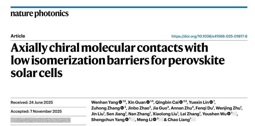 该研究成果以《低异构化势垒的轴向手性分子实现高效稳定的钙钛矿太阳能电池》(“Axially chiral molecular contacts with low isomerization barriers for perovskite solar cells”)为题于1月19日在《自然光子学》(Nature Photonics)期刊上在线发表。西安交通大学物理学院博士研究生杨文涵为论文的第一作者;物理学院博士研究生关心和福建农林大学青年教师蔡庆斌为论文的共同第一作者;物理学院梁超教授、杨生春教授、吴宥伸副教授以及河南大学李萌教授为论文的共同通讯作者;西安交通大学物理学院和电工材料电气绝缘全国重点实验室为本论文第一完成单位。工作同时得到了物理学院张磊教授和张楠副教授的指导。西安交通大学分析测试中心郭航、梁艳和周佩老师在材料结构测试与分析方面提供了大力支持。本研究得到了国家重点研发计划、国家自然科学基金、西安交通大学青年拔尖人才支持计划、中央高校基本科研业务费以及电工材料电气绝缘全国重点实验室等项目的资助。