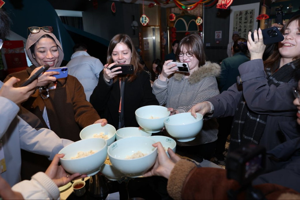 市井烟火气,最抚凡人心。回民街的灯笼长廊下,老铜锅中翻滚的羊肉泡馍、油亮诱人的腊汁肉夹馍成为镜头焦点,吹糖人手艺人与中外游客的互动场景,尽显美食民俗与城市温情。在掰馍体验环节,青年创作者们特写记录手工掰制馍粒的指尖动作,非遗传承人演示的炖煮火候与调料配比,以及第一口品尝时汤汁浸润馍粒的满足表情,让柬埔寨青年TAN SOPHEA直呼:“这不仅是美食,更是一种充满仪式感的文化体验。”