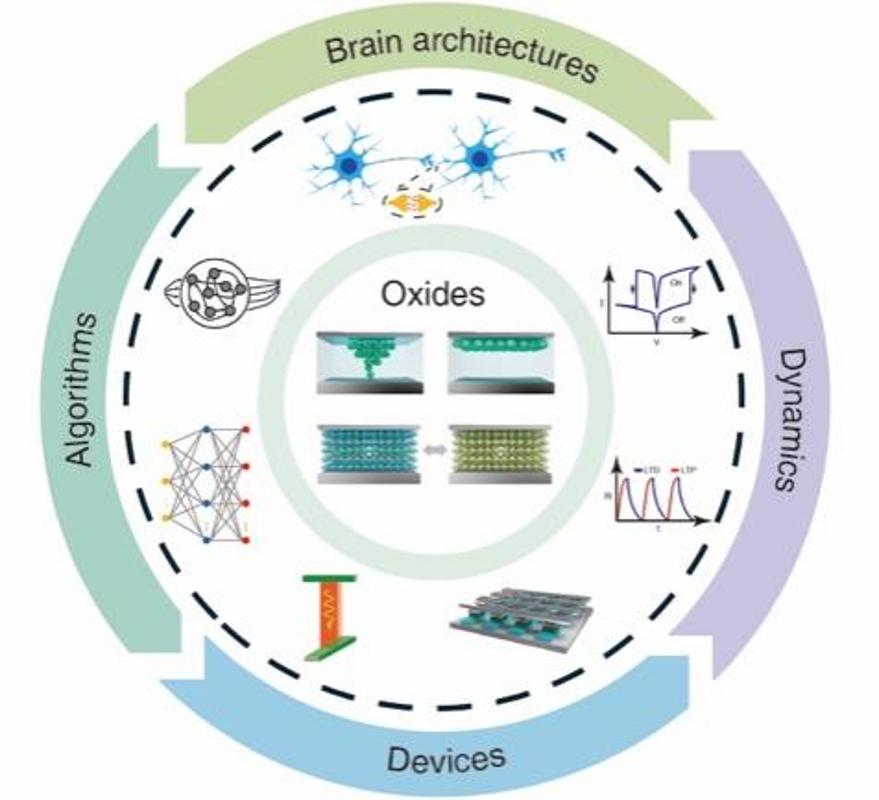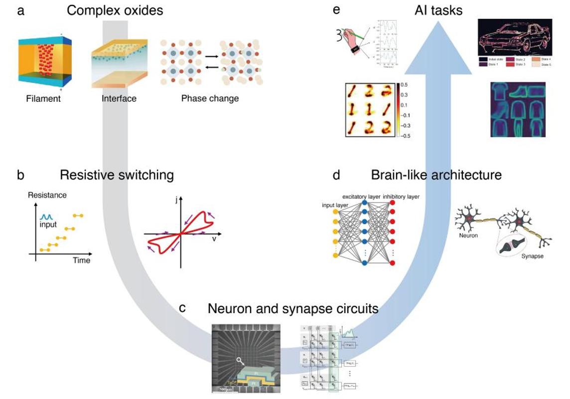 人脑由千亿级神经元和突触构成,是自然界最高效的计算平台,具备卓越的学习、记忆与并行处理能力,同时功耗极低。受此启发,类脑计算(Neuromorphic Computing)成为突破传统冯·诺依曼架构瓶颈的关键方向。其中,阻变器件(Resistive Switching Devices)因其结构简单、可微缩性强、能耗低等优势,被视为实现人工突触功能的理想候选器件。而复杂氧化物材料由于其丰富的亚稳态和强关联电子特性,在外加电场下可展现出多样化的阻变行为,为模拟生物神经元的脉冲特性以及突触的可塑性、适应性等非线性动力学特性提供了独特平台。